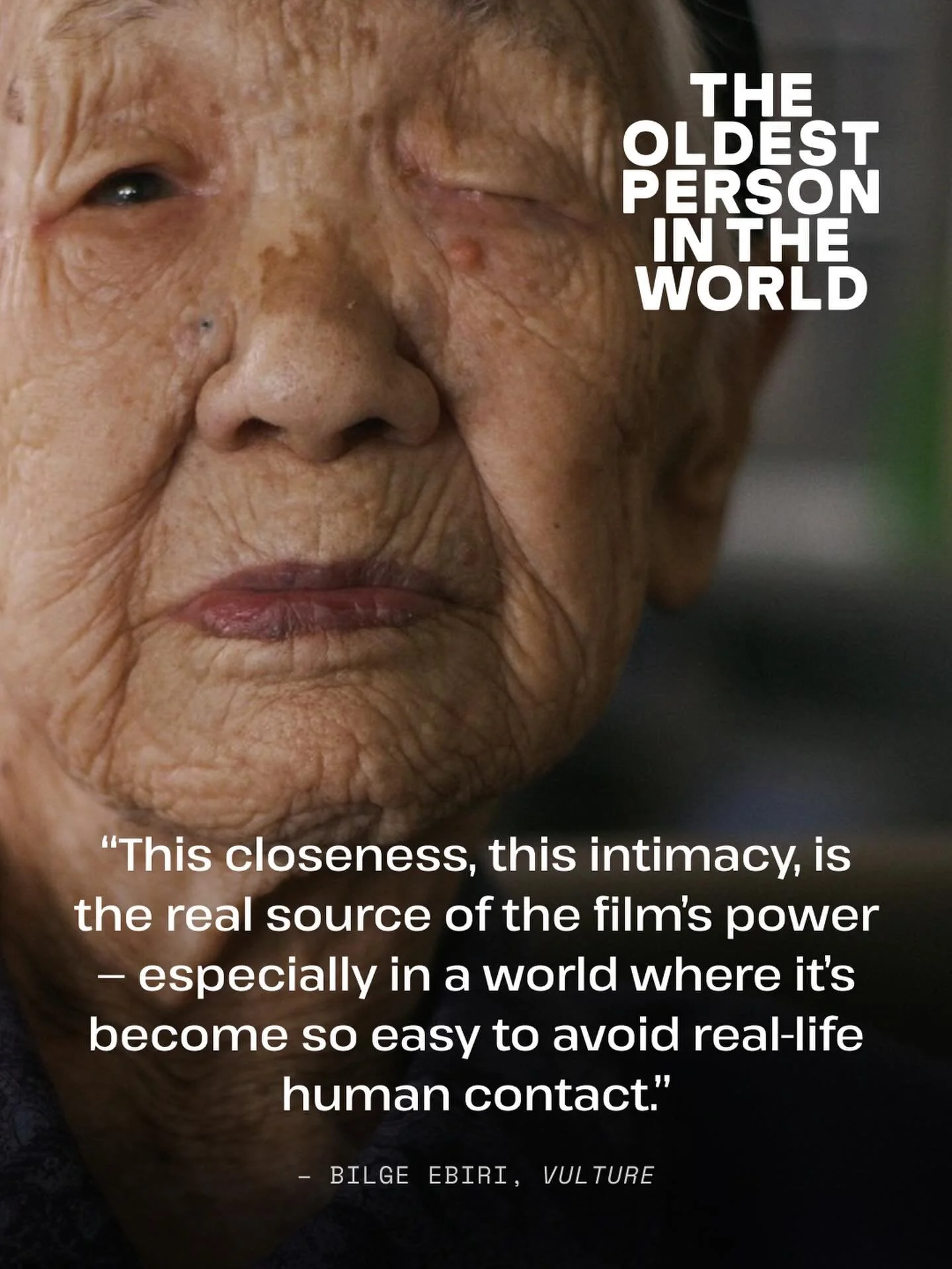 THE OLDEST PERSON IN THE WORLD is a decade-long global journey chronicling the ever-changing record holders of the title of oldest person alive. What begins as a portrait of longevity becomes a meditation on the passage of time, the randomness of fate, and the joy and profound human experience of being alive.
